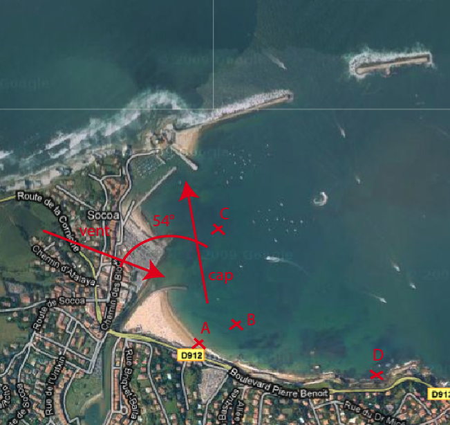 Il y a plus d’une semaine malgrè le vent très faible, j’ai tenté de faire quelques bord à socoa. J’avais fait pas mal de modifs, notament au niveau de l’accroche, que je voulait absolument tester. Après une bonne heure à tenter de maintenir l’aile au zenith, je profite d’une raffale stabilisatrice pour me lancer (point A). Aussitôt suit une dévente qui laisse choire l’aile dans l’eau, me traine comme une ancre flottante jusqu’au point B sans vouloir redécoller. Et puis miracle, une raffale! L’aile se tourne puis redécolle enfin, elle monte, je la fait travailler un peu, ça tire, je sert le vent, c’est parti, ça plane! Tout marche bien, je fait d’énorme sinusoides avec le kite, j’ai décroché mon harnais, je suis bien assis, je remonte au plus près, bordé à fond jusqu’au point C. J’ai réussi à faire un cap de + ou – 55° au planing avec un vent super faiblard, ce qui me laisse confiant pour la suite. Après c’est beaucoup moins drôle, je tente un virement de bord mais ce foutu vent décide de m’abandonner lachement, l’aile tombe. J’ai dérivé jusqu’au point D tiré par le kite posé sur le bord d’attaque qui refusait absolument de redécoller. Résultat des course, j’ai fini dans les cailloux, avec trois kilo d’algues et des dechets dans les lignes et surtout de sacré déchirures dans la voile. En plus je me suis rendu compte que le coude de mon bras avant n’avait pas tenu et menacait de complètement casser.