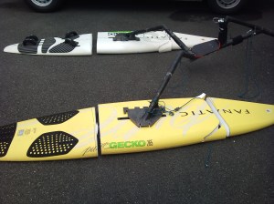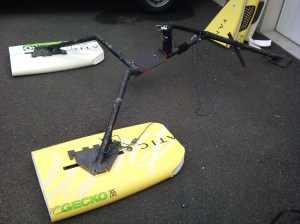 A l’origine ce canot est fait pour valider les principes que je voudrais utiliser sur la version « record de vitesse ». Aujourd’hui c’est le cas, le système de paravanes, d’attaches, de forces et de couples, tout ça est OK pour le jours où je trouverai un sponsor qui sera près à lancer la construction du DRAED65, pourquoi pas. Mais on ne cherche pas à battre un record tout les jours, et j’aimerai bien continuer mes recherches, avec la même base, pour faire quelque chose de plus ludique, fun. Mes flotteurs étaient taillé pour le speed, long et étroit, donc difficile à faire planer. Les nouveaux seront beaucoup plus large et plats, ce qui devrait me permettre de planer plus tôt. Ensuite, en utilisant les rails de pied de mats j’aurai un montage/démontage super rapide et plus de possibilité de réglage. Enfin je prépare un petit truc pour rendre mon engin un peu plus joueur. Avec les paravanes, ça accroche tellement qu’une fois calé il n y a plus rien à faire.