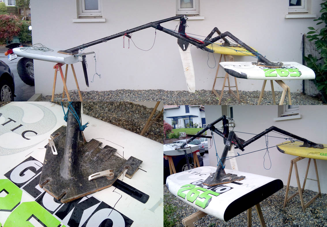 Avec cette dérive centrale juste sous le point de tire je vais caper comme un monocoque et le safran sera quasi neutre, donc si je saute sur le clapot je garderai un bon contrôle. Avec ces nouveaux flotteurs arrières beaucoup plus lage, le planning se fera plus tôt ce qui vas me permettre de naviguer par petit temps et puis grace à leurs rails de pied de mat, le montage est ultra rapide. La dérive centrale vas biensur augmenter le couple de chavirage mais ça ne me dérange pas d’avoir un bateau plus « joueur ».