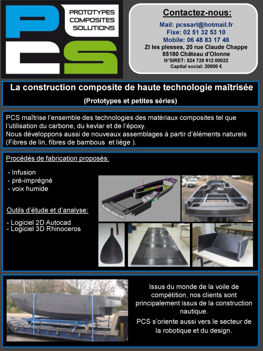 Le projet DARED est aujourd’hui arrivé à un stade où le bricolage d’amateur ne suffit plus. Tous les principes sont validés et j’ai, à présent, une idée très précise de ce que doit être le DARED. Pour continuer le projet, il faut changer de niveaux et faire confiance à de vrai professionnels. le chantier PCS (Prototypes Composites Solutions), basé à Château d’Olonne sera le prochain constructeur du nouveau prototype. C’est l’histoire de 2 potes qui travaillaient sur des monstre de carbone comme l’hydraplaneur, des imoca…et autres bête de puissance, ils ont ensuite décidé de monter leur propre chantier pour ce consacré aux éléments de hautes technicité. PCS innove constament sur l’alliance des materiaux, le process de fabrication, et le design avec leur pirogue OC1. Autant vous dire que l’engin qui vas sortir de là n’aura rien à voir avec mon kiteboat actuel.