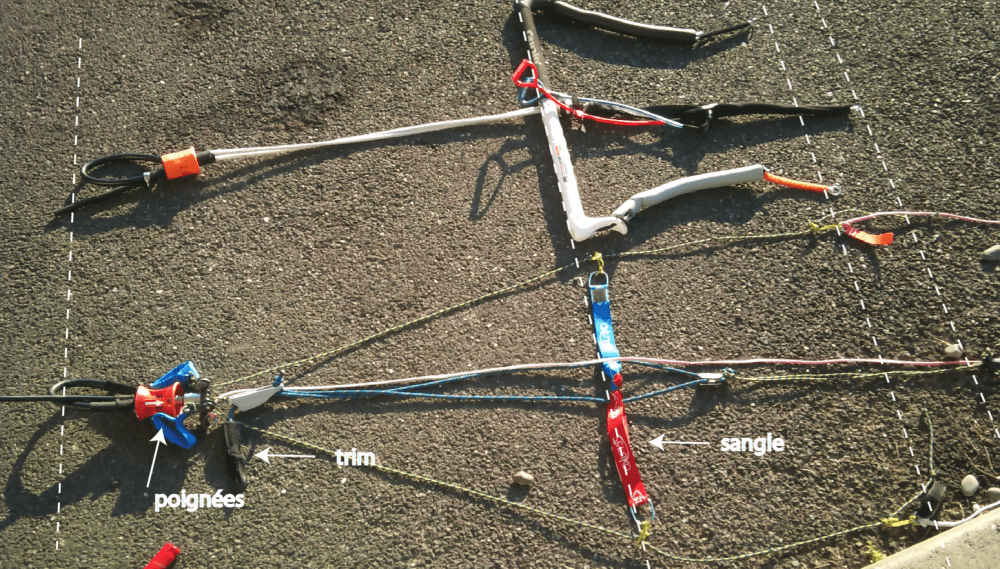 Je suis persuadé qu’un des point le plus importans pour concevoir un kiteboat viable est le système d’accroche entre le kite et le bateau. Il faut que la liaison soit facile à utilisé, facile à mettre en place, et apporte autant de sécurité (sinon plus) qu’en kitesurf. C’est pour çela que j’ai cherché à adapter, de différentes façon, une barre classique au système que je trouvait le meilleur et le plus ergonomique, c’est à dire des renvoies en face du pilote. L’ajout de drisse sur les arrières passant dans la barre marche bien et offre une bonne sensation de l’aile mais ça ne me satisfait pas pour 2 raisons: Une fois les poignées en main la barre laissée libre se balade trop à mon gout et puis surtout il y un problème pour dé-twister les lignes qui peut devenir vraiment très génant. Alors voila, j’ai sauté le pas. Au lieu de m’obstiné à régler le probléme au dessous de la barre, je l’ai fait au dessus. Il suffit de déconnecter les avant et les arrières, c’est à dire 4 noeuds à défaire seulement, et les reconnecter sur le système de barre souple. Souple, parce qu’en fait, la barre est remplacée par une sangle qui sert à controler l’aile d’une main si nécessaire. Attention, ce n’est pas fait pour naviguer d’une seule main, juste pour facilité l’entrèe et la sortie de l’eau et libérer une main. Je posterai bientôt les premiers test.